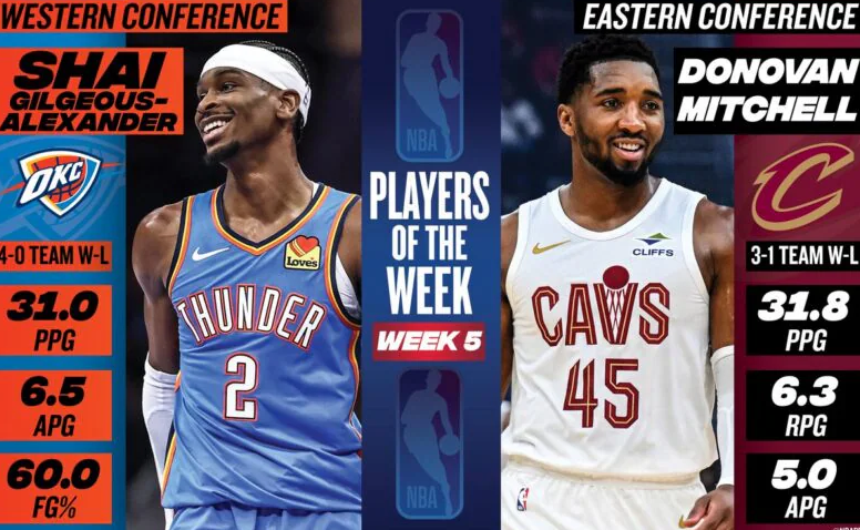 谢伊·吉尔吉斯-亚历山大、多诺万·米切尔被评为NBA周最佳球员俄克拉荷马城雷霆后卫谢伊·吉尔杰斯-亚历山大和克利夫兰骑士后卫多诺万·米切尔被评为2025-26赛季第5周NBA周最佳球员。